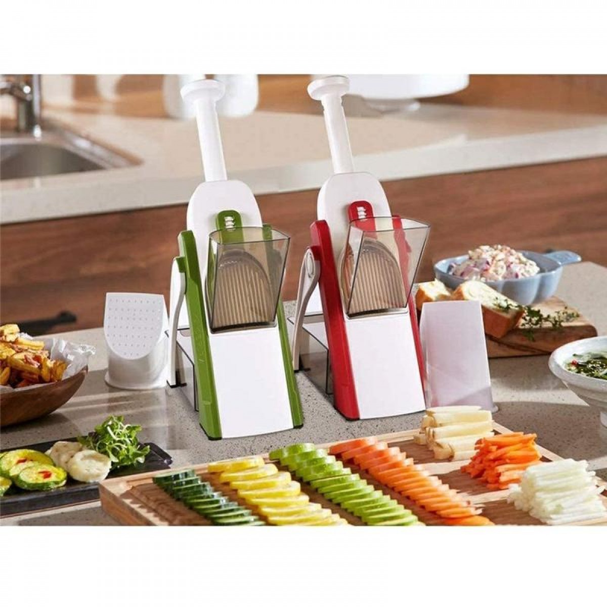 شما با استفاده از این خردکن دستی ماندولین همه کاره میتوانید انواعی از برش ها را در ضخامت های مختلف مانند: اسلایسی، نواری(سیب زمینی)، خلالی و نگینی داشته باشید و کار خرد کردن مواد را آسان تر و سریع تر از همیشه انجام دهید.